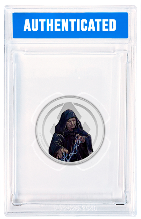 • Double-sided collectible features Yoda with the Jedi Order Crest on one side and Emperor Palpatine on the other side, in front of the Sith Eternal crest.